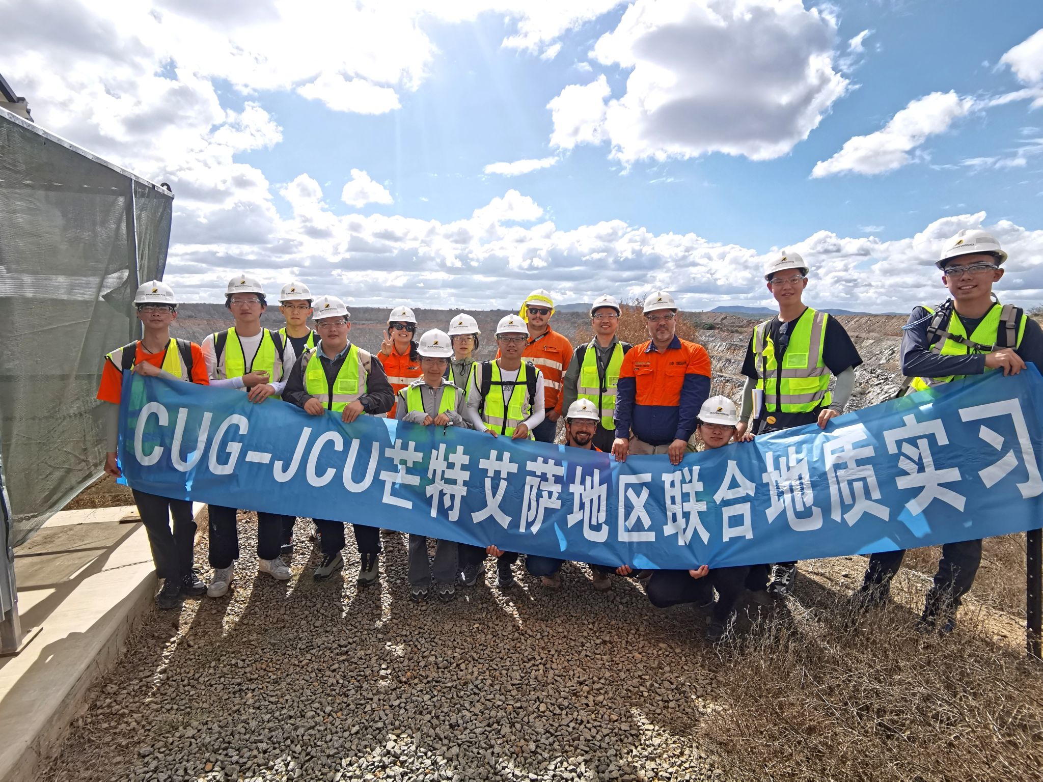 在澳大利亚内陆城市芒特艾萨,来自资源学院的10名本科生与詹姆斯·库克大学的学生开展联合野外地质实习。同学们观察褶皱带变质沉积岩与侵入体的接触带形态、断层与褶皱的交切关系以及该地区矿化蚀变现象,参观超大型金矿的露天采坑、岩心库以及深孔打钻现场,学习大型金属矿山的地采选冶流程。