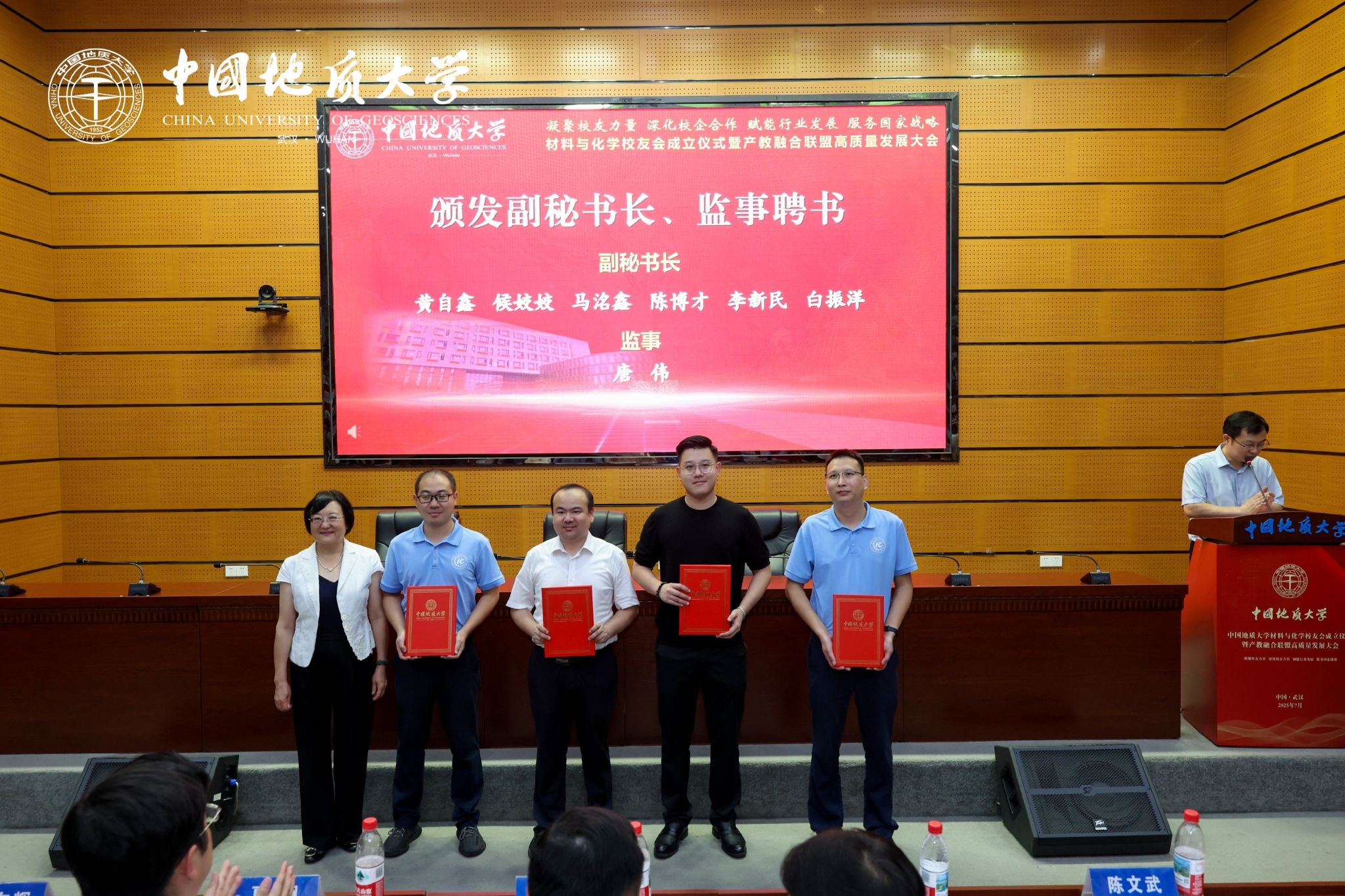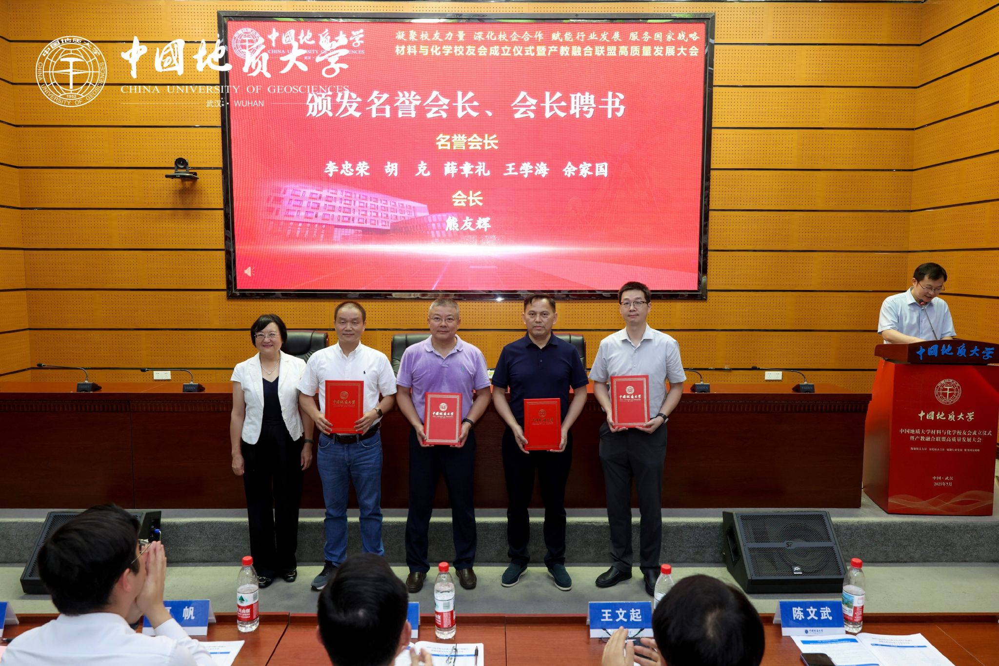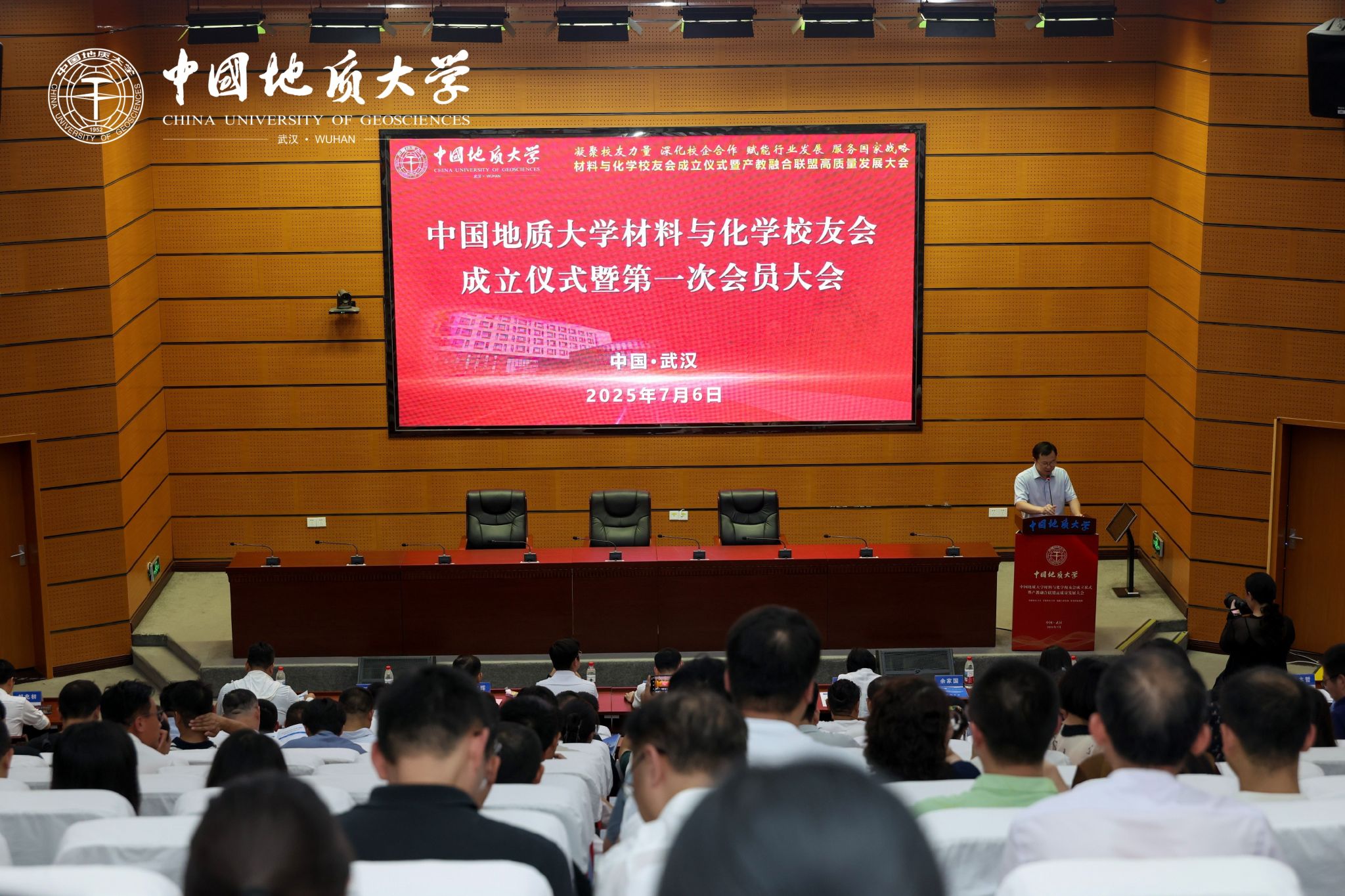 地大新闻网讯 (通讯员 陈雨蛟 白振洋)7月6日,73882必赢网页版材料与化学校友会成立仪式暨产教融合联盟高质量发展大会在南望山校区A0113会议室举行。副校长夏帆、王文起,党委常委、组织部部长陈文武,50余家政校企单位,各地校友会与兄弟高校校友会代表及150余位校友,73882必赢网页版相关职能部门、教学单位负责人,200余名材料与化学学院师生代表参加会议。成立仪式由材料与化学学院党委书记梁本哲主持。