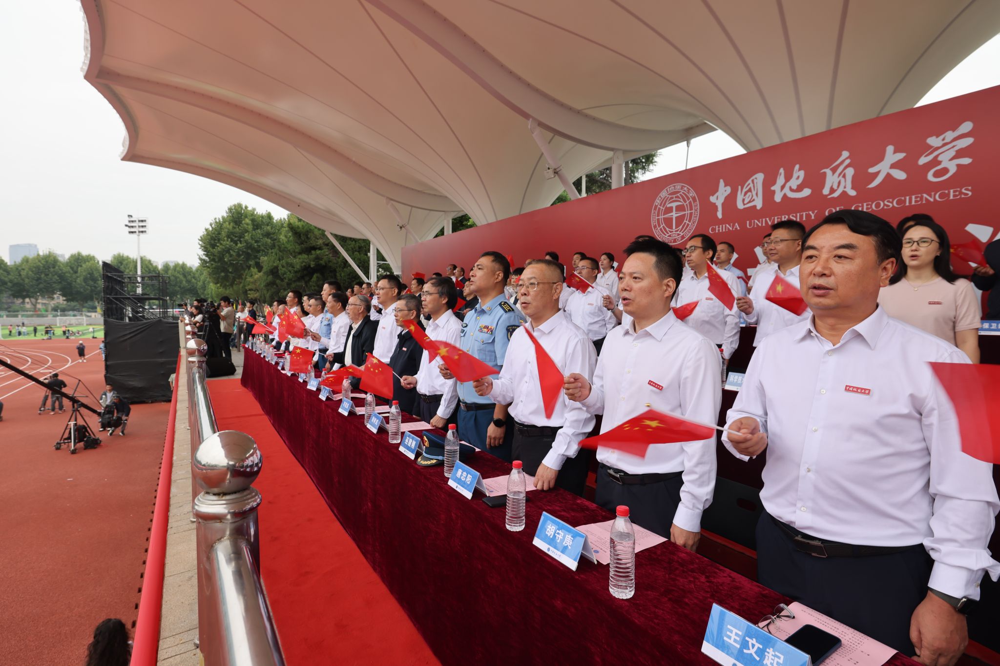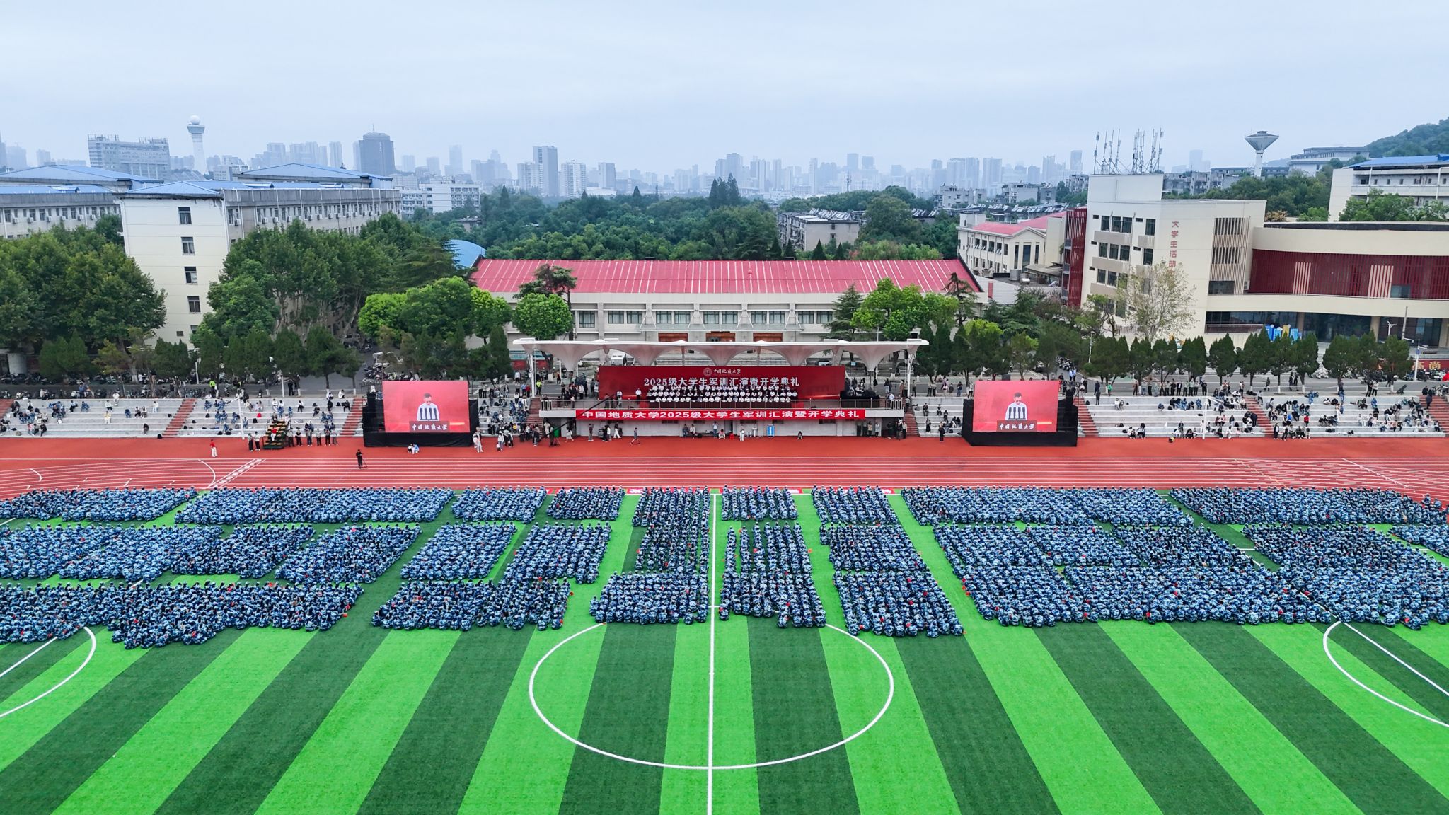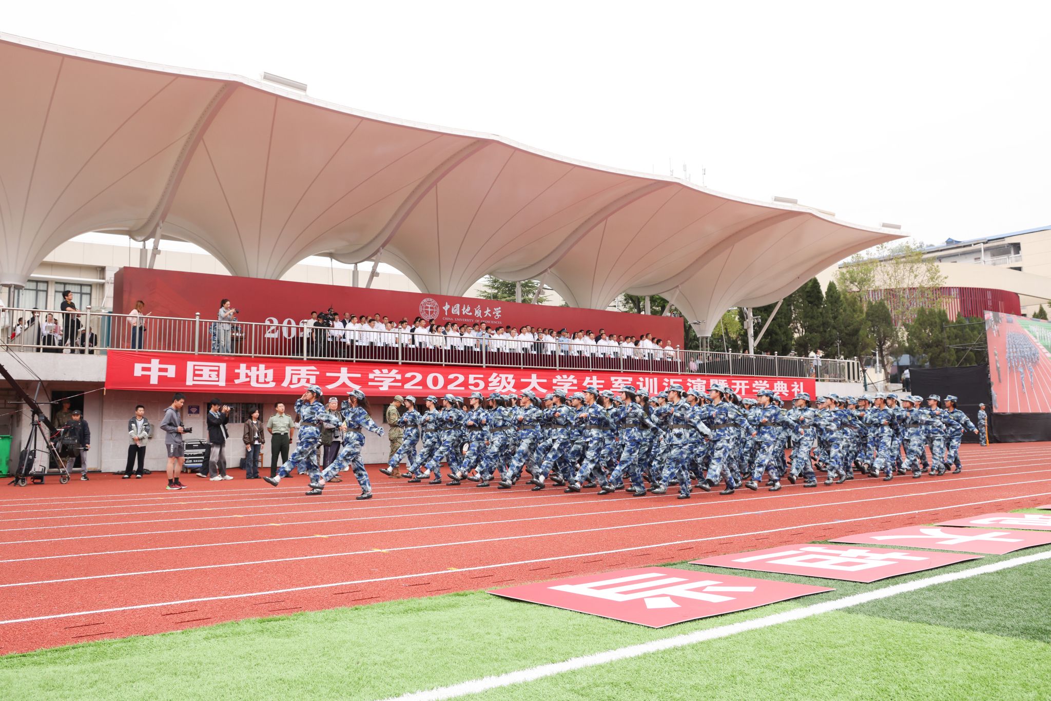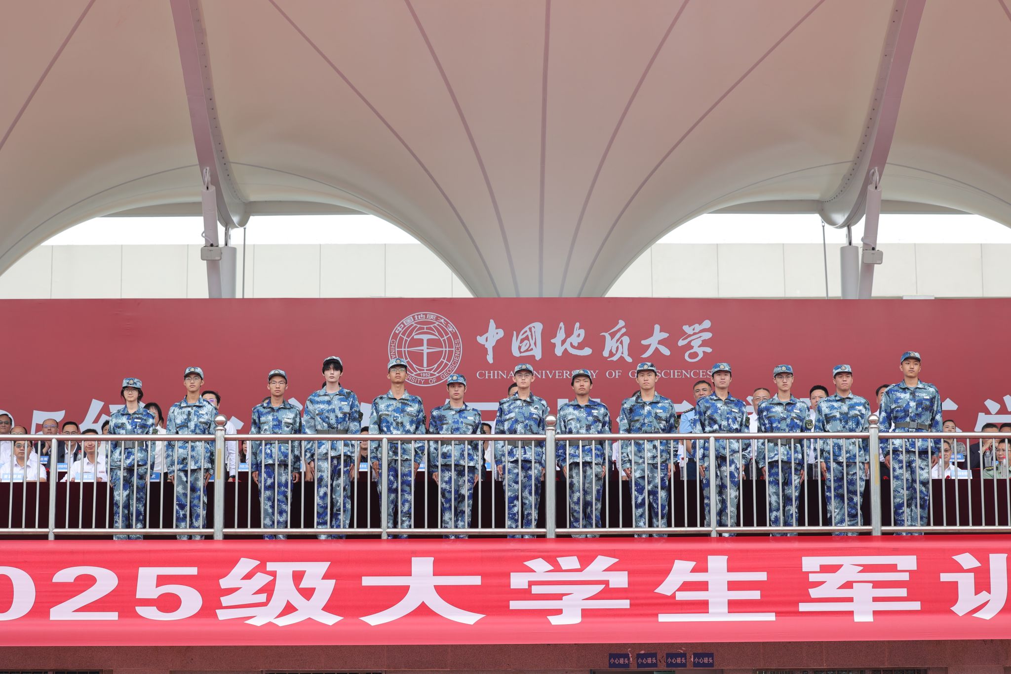 校党委书记刘杰,校长李建威,中国科学院院士殷鸿福、谢树成,教育部直属高校党建工作联络员谢守成,军训承训单位空军预警学院有关领导,校党委副书记唐忠阳、王甫,副校长章军锋、胡守庚、夏帆、王文起,党委常委、党委组织部部长陈文武,教师代表、地球科学学院教授马强,校友代表、中铁第一勘察设计院集团有限公司高级工程师王杜江,各教学科研单位、管理服务机构主要负责人,教师代表,辅导员老师,高年级学生代表,全体承训教官以及2025级全体本科新生参加典礼。