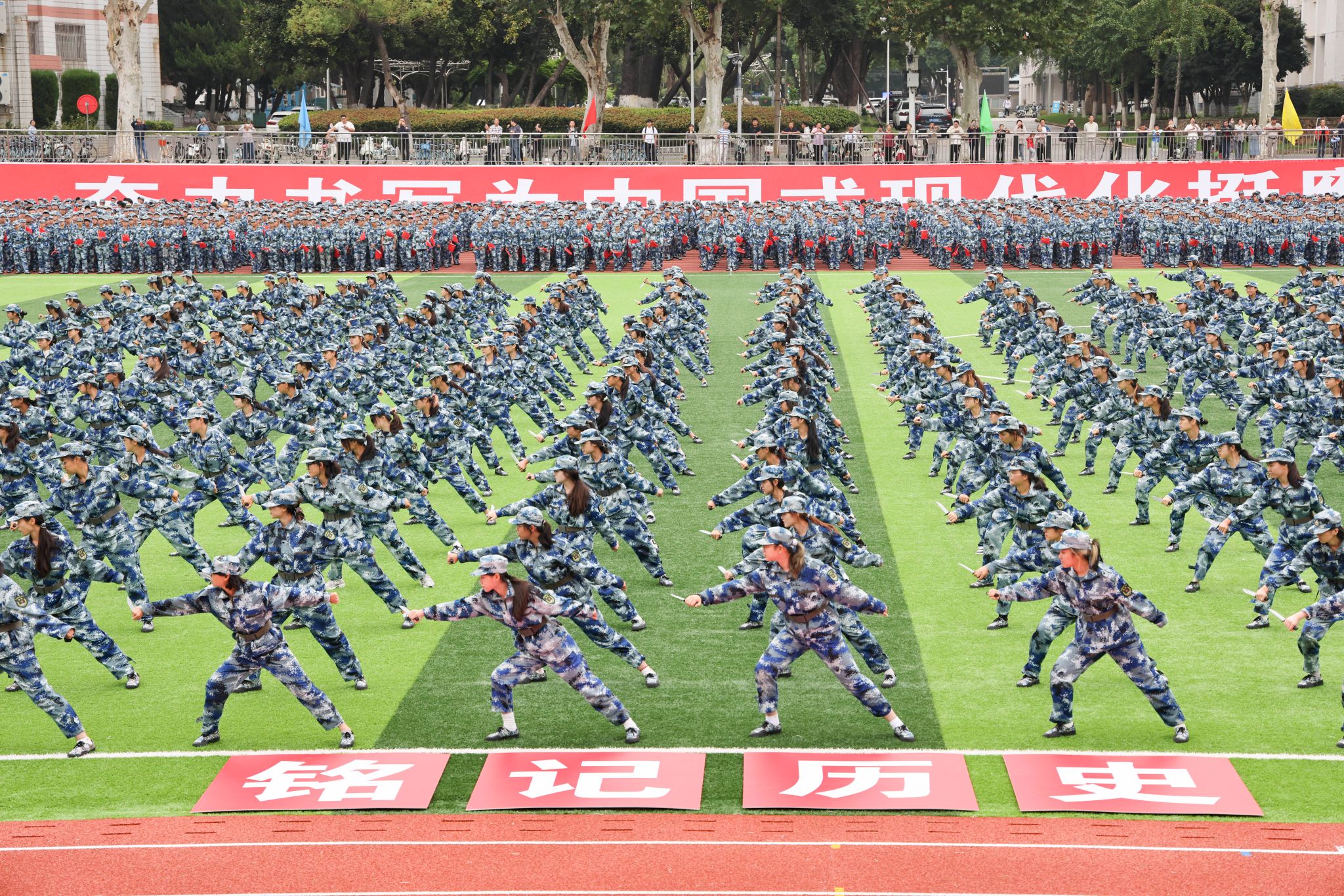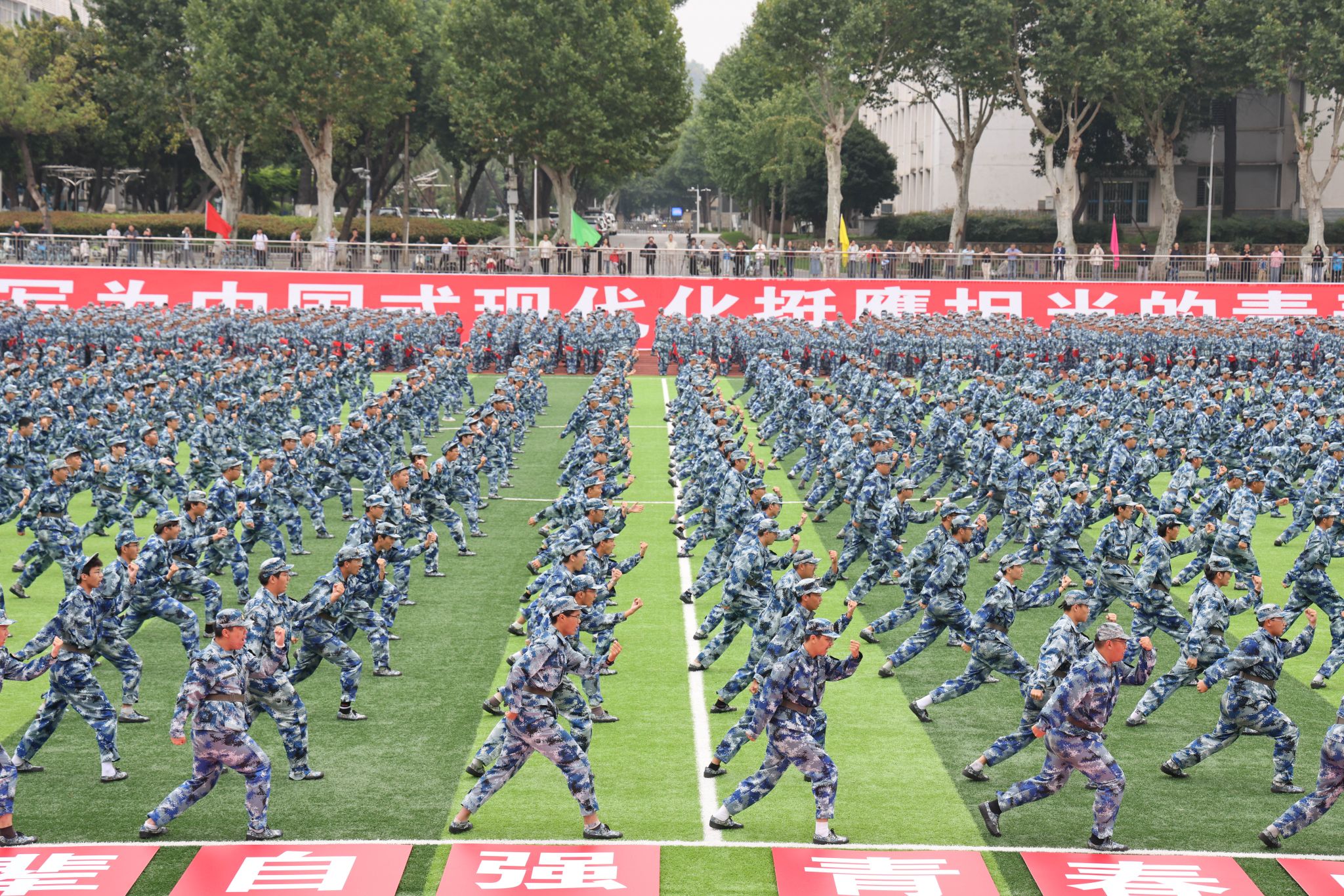 军体拳方阵由800名男生组成。他们的动作行云流水,刚劲有力,展现昂扬向上的精神风貌。