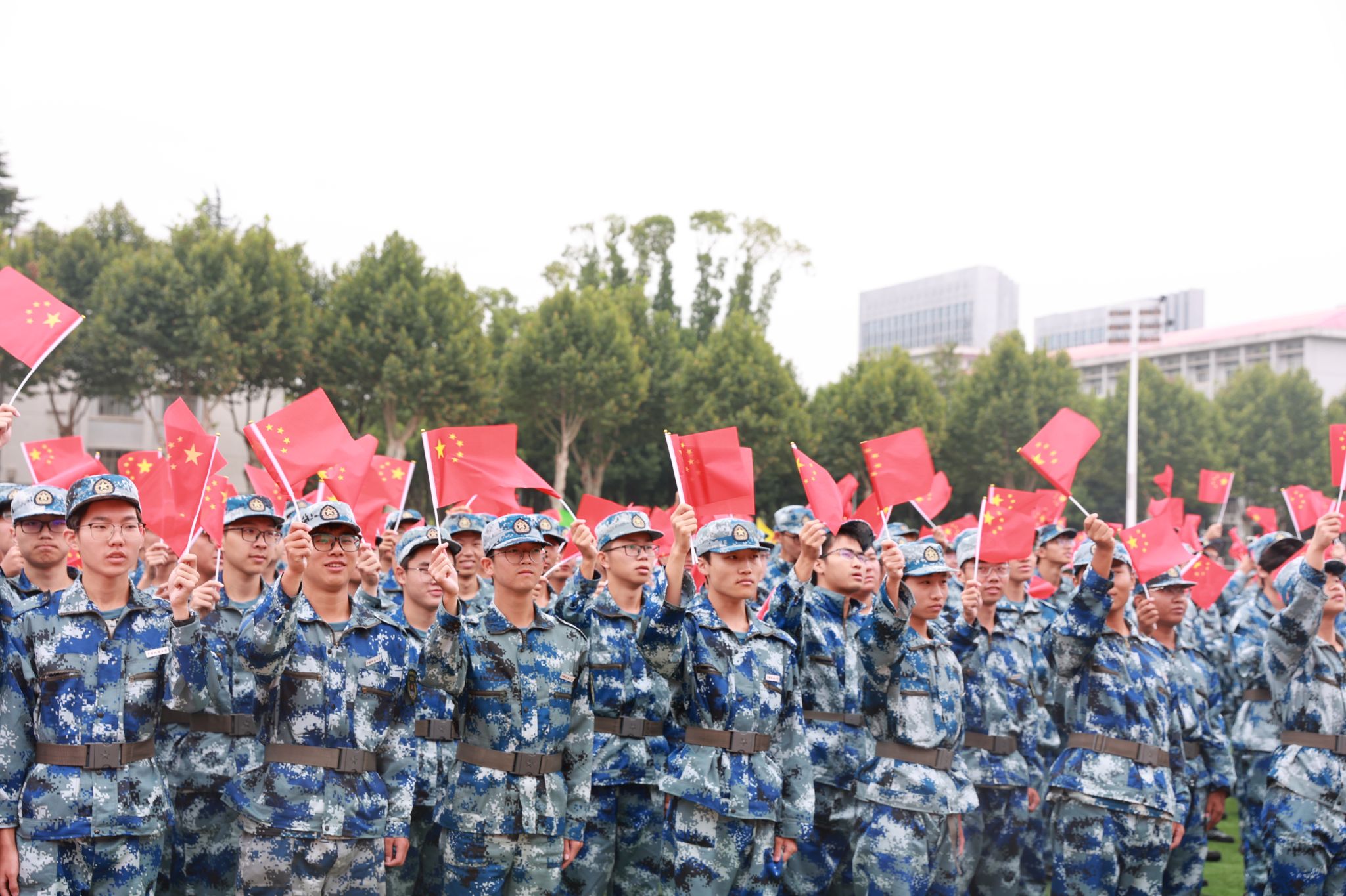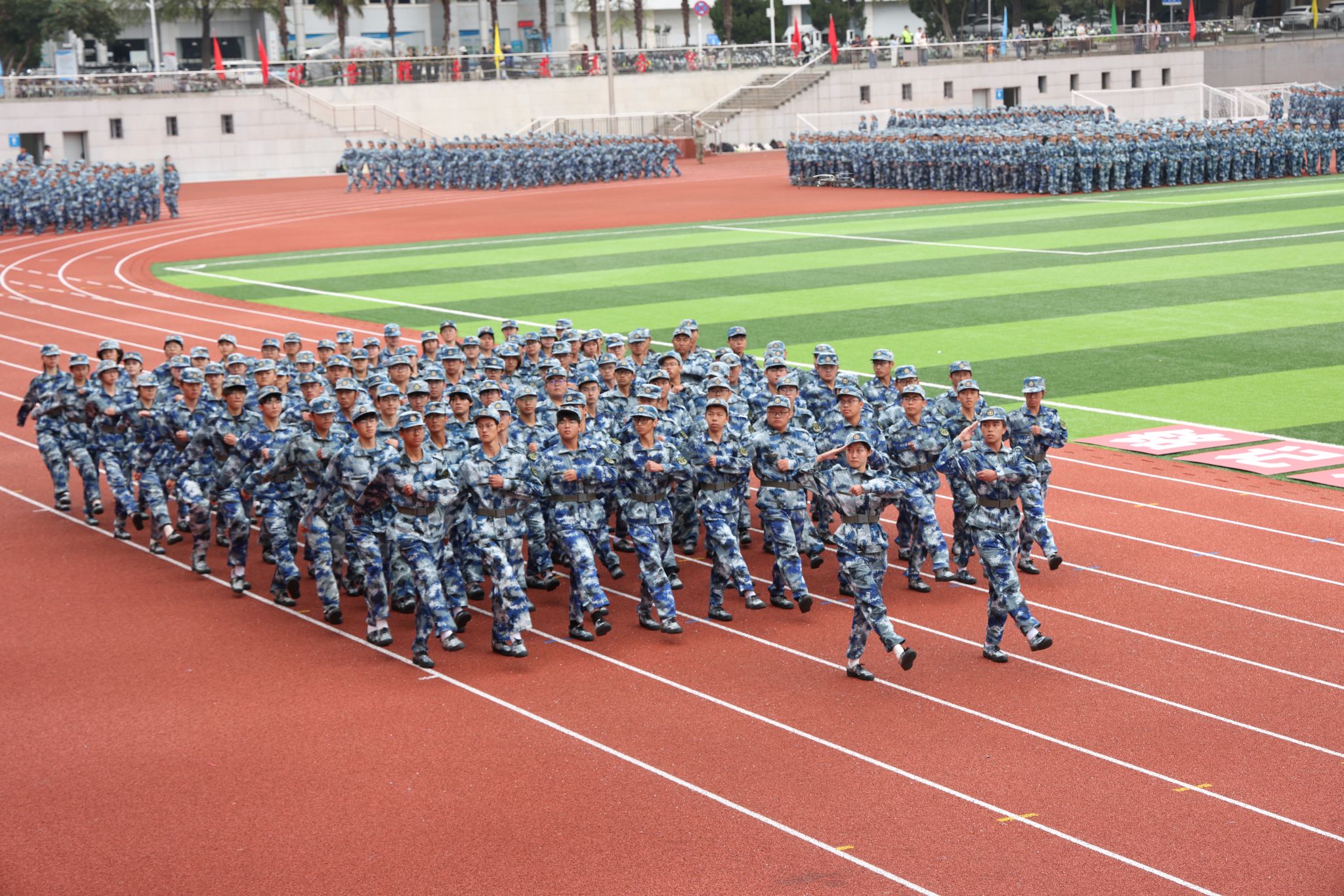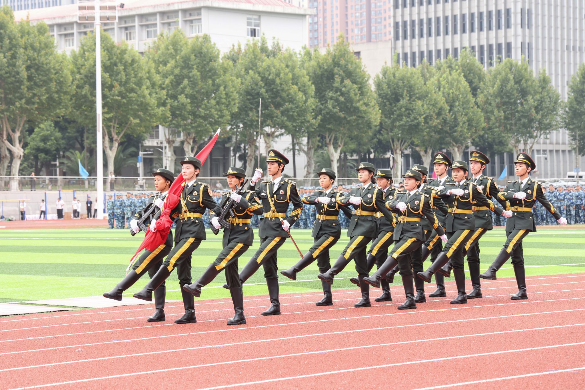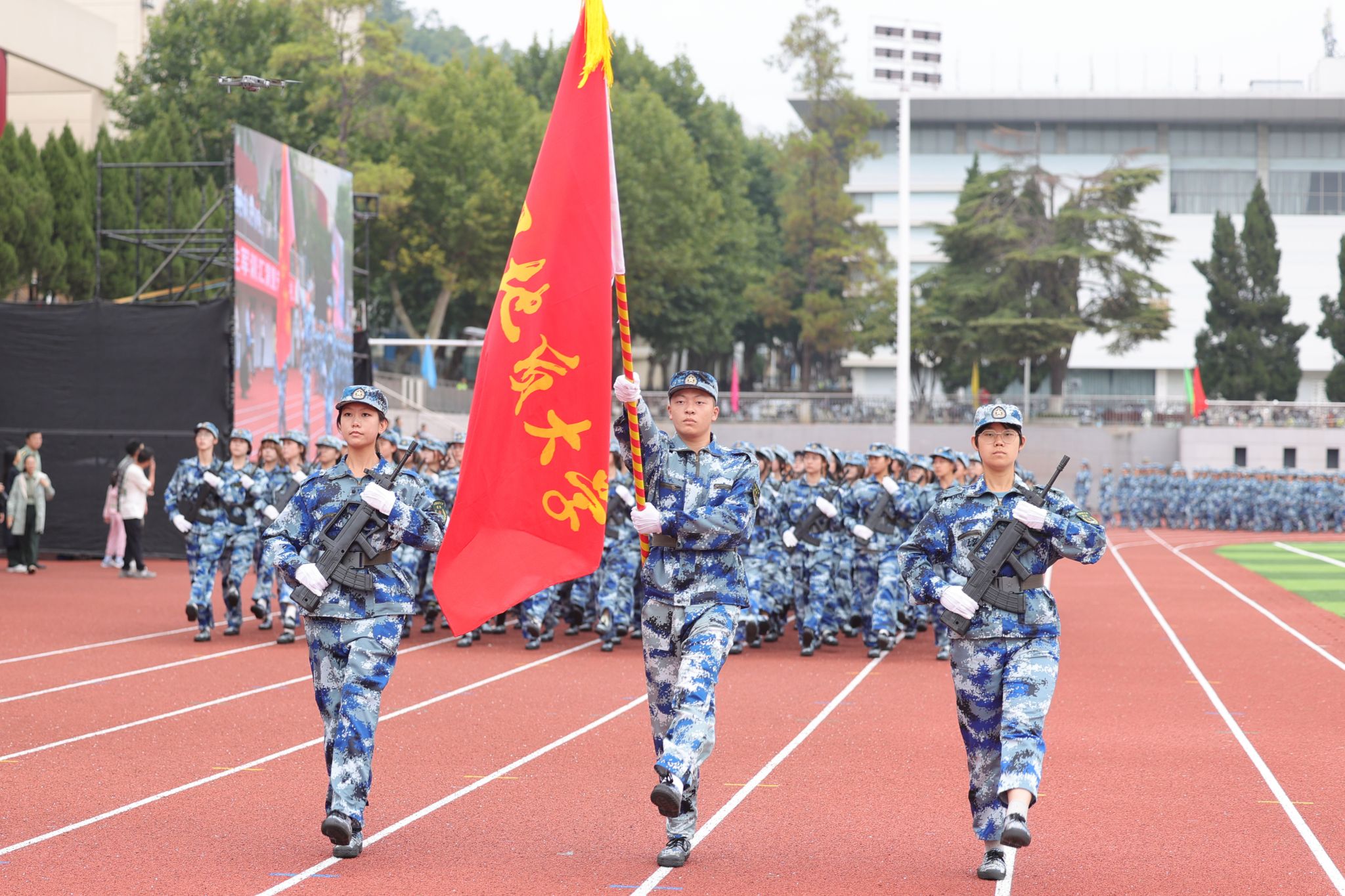 各学院新生组成的33个方阵斗志昂扬,以饱满的精神、严整的队形、嘹亮的口号,依次走过主席台前接受检阅,他们身姿挺拔如松、步伐整齐划一,展现了地大学子积极向上的青春风采。