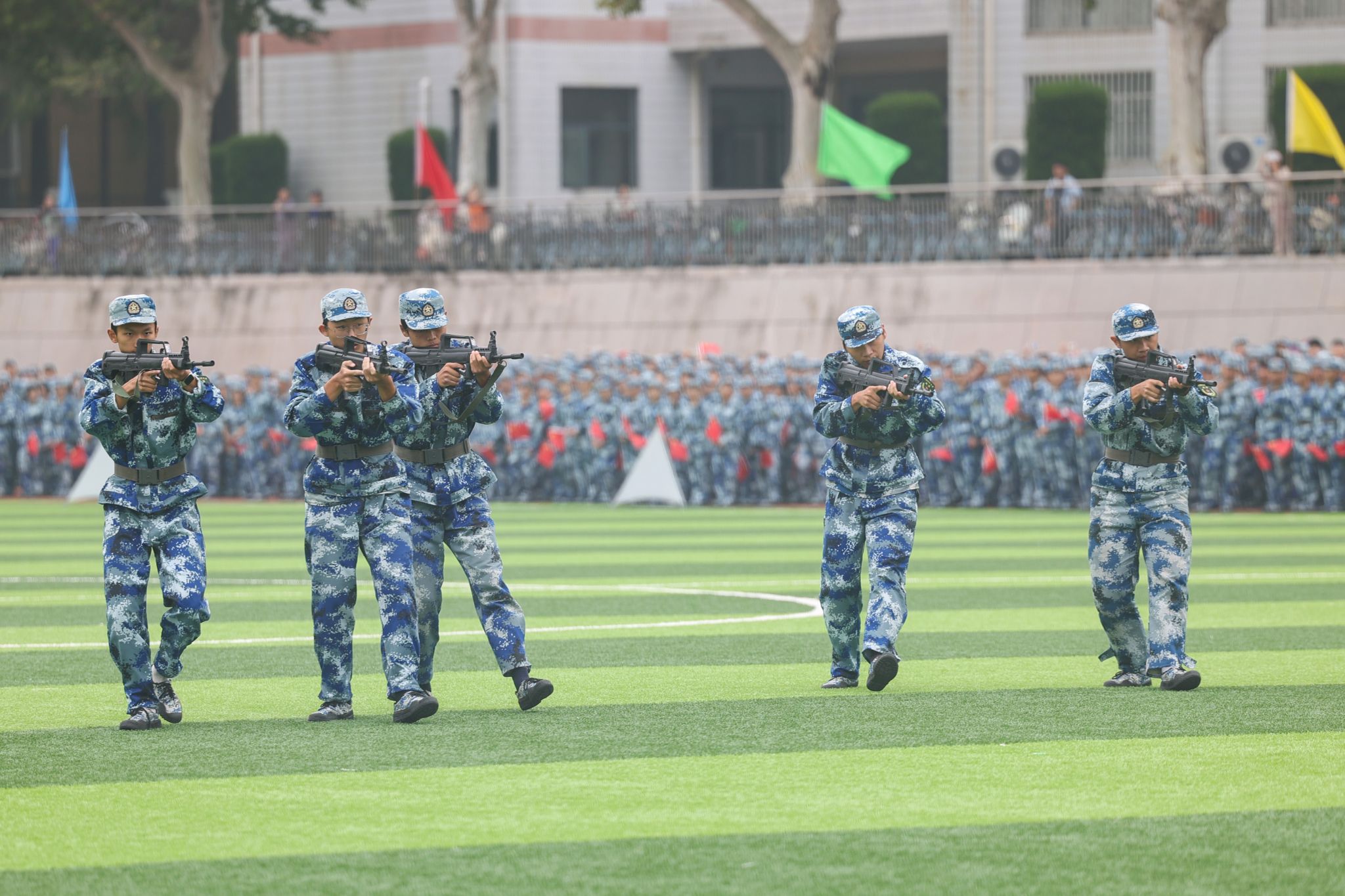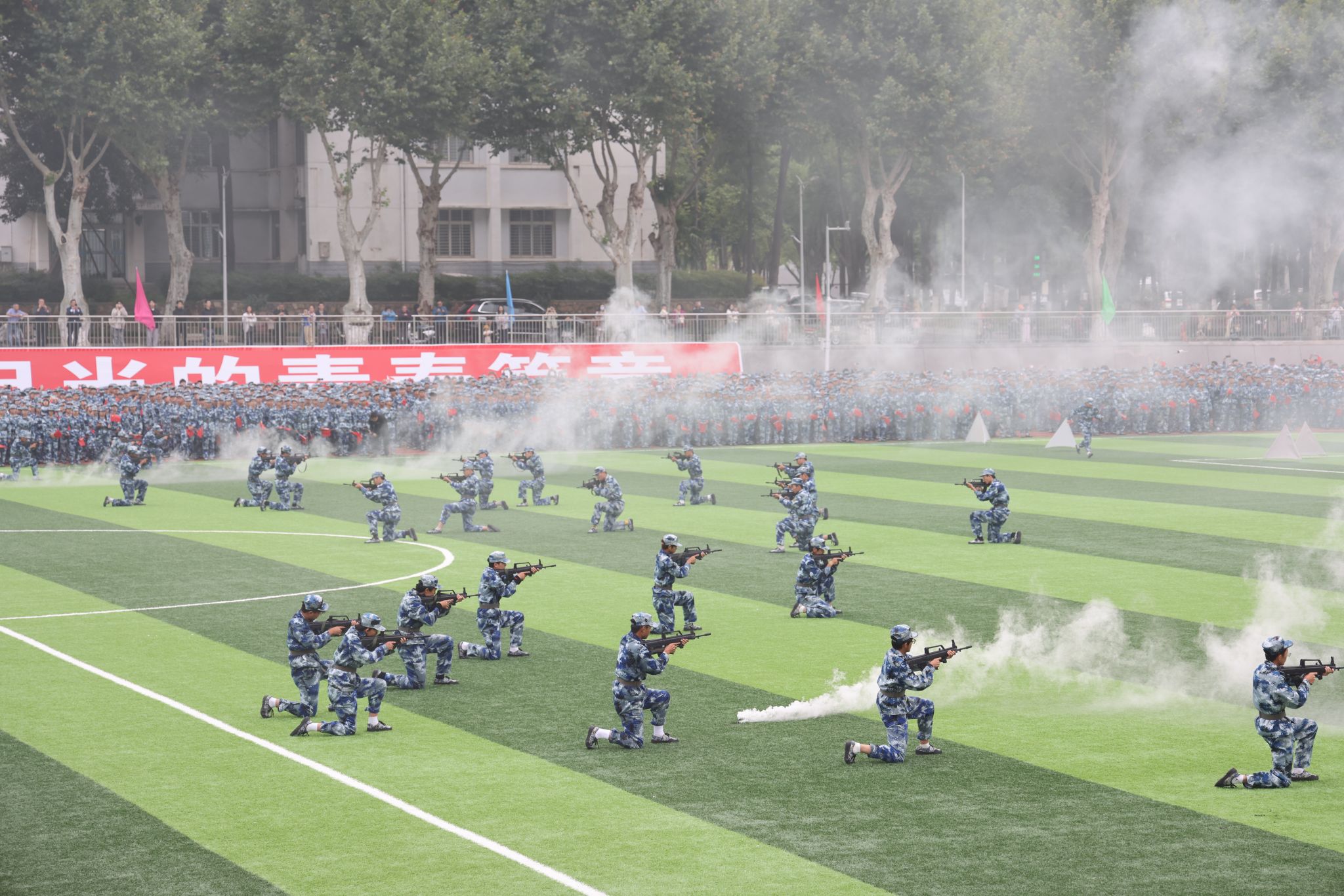 战术方队由20余名男生组成,他们在“炮火”隆隆、“枪声”阵阵中,低姿匍匐、屈身跃进、精准射击,突破层层封锁防线,完成战术目标,展示了一场扣人心弦的对抗演练。
