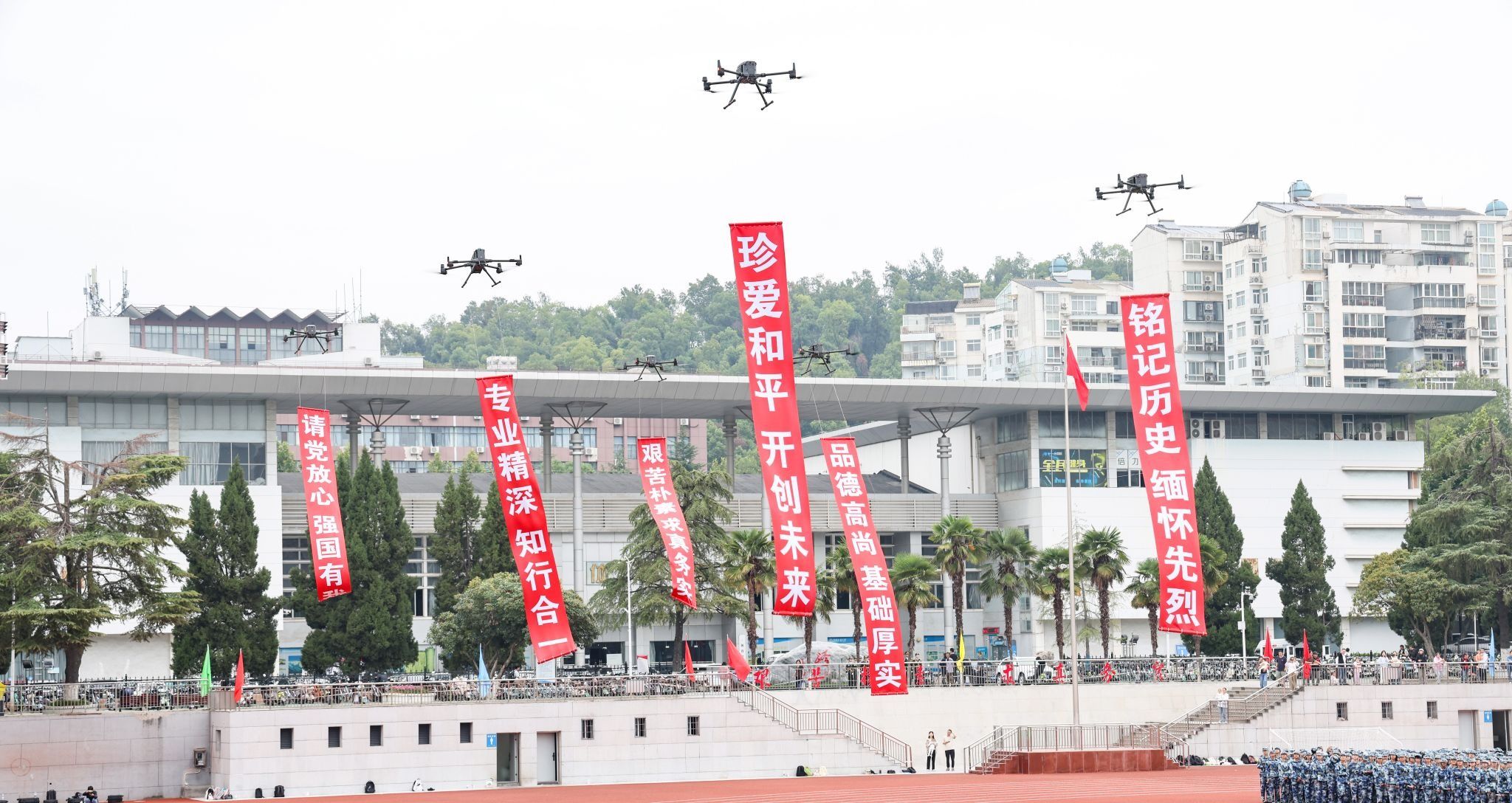 “地信低空创新项目研究组”飞行队悬挂条幅飞行入场,展现了学校的校训精神和人才培养目标,响应弘扬伟大抗战精神、“请党放心、强国有我”的号召。