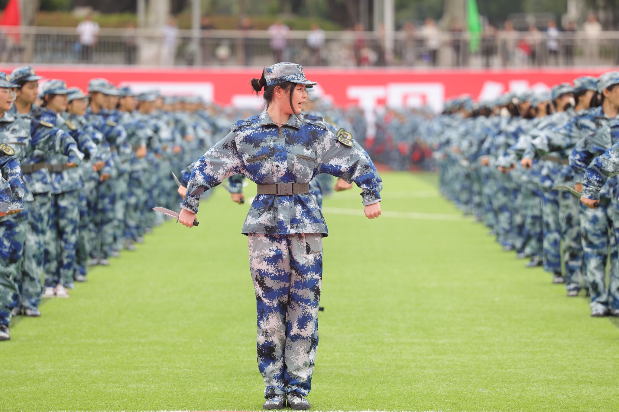 匕首操表演方队由500名女生组成。她们英姿飒爽、刚柔并济,传递出了永不退缩、勇往直前的必胜信念。