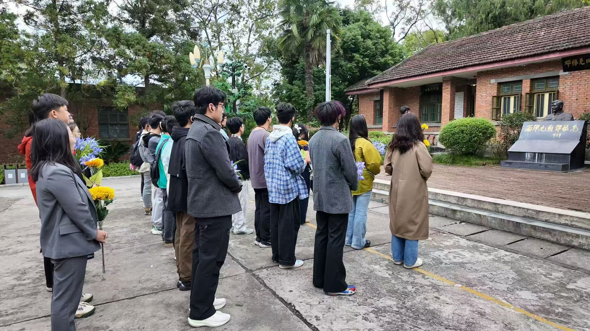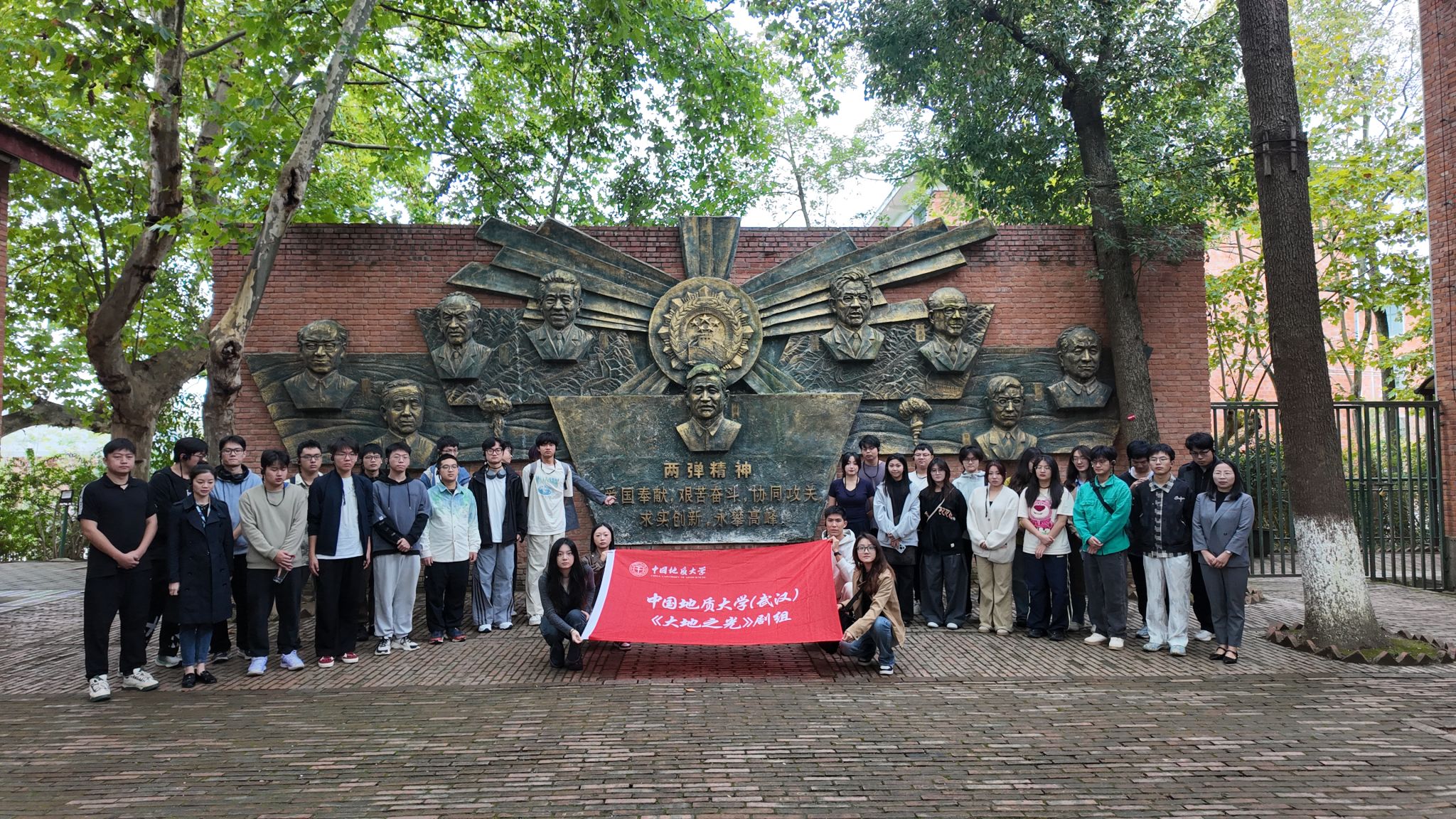 此次演出恰逢我国第一颗原子弹爆炸成功61周年,10月18日,剧组全体师生走进位于四川省绵阳市梓潼县的“两弹城”爱国主义教育基地,完成了一次从地质学家爱国情怀到“两弹一星”精神的深度对话。全体人员在邓稼先铜像前肃立致敬,献上鲜花表达对先辈的深切缅怀与崇高敬意。场馆中陈列的铀矿模型与话剧中勘探铀矿的剧情遥相呼应,让师生在历史与艺术的交融中,进一步体悟了李四光等新中国第一代科学家“爱国、求是、担当、奉献”的价值追求。(审稿 陈华文)
