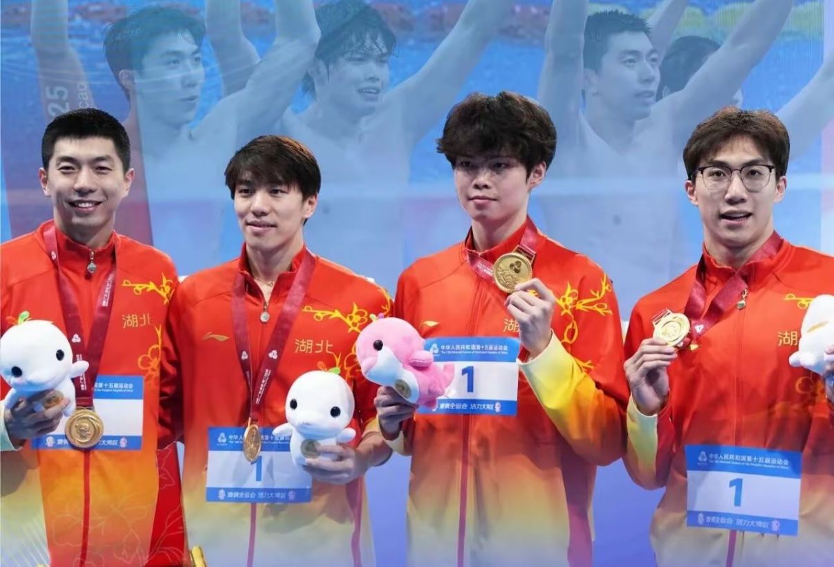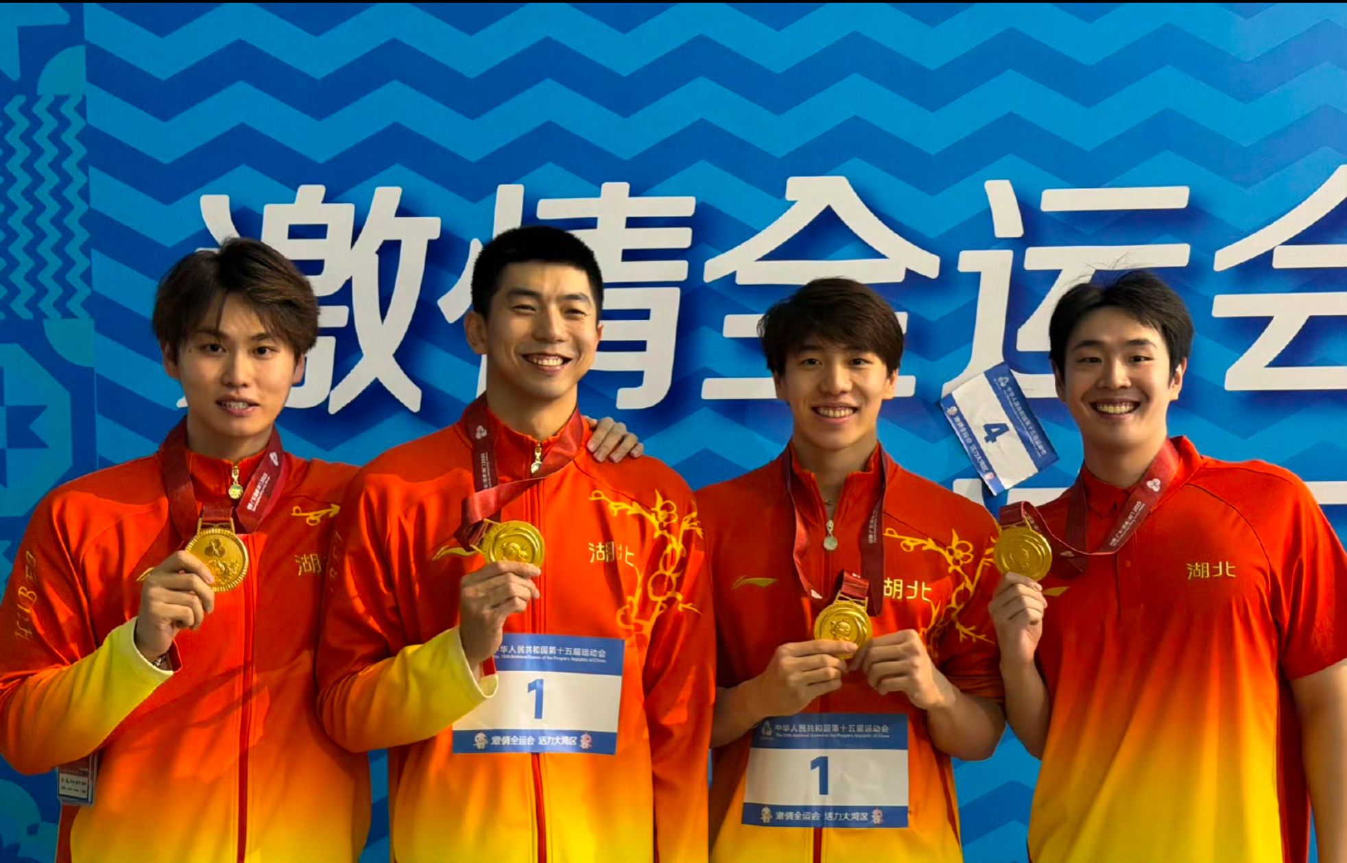 游泳项目中,体育学院2023级研究生孙佳俊、校友闫子贝与队友王梓成、徐海博紧密配合,以3分34秒39的成绩夺得男子4×100米混合泳接力冠军,这是湖北队该项目历史上首枚全运会金牌。