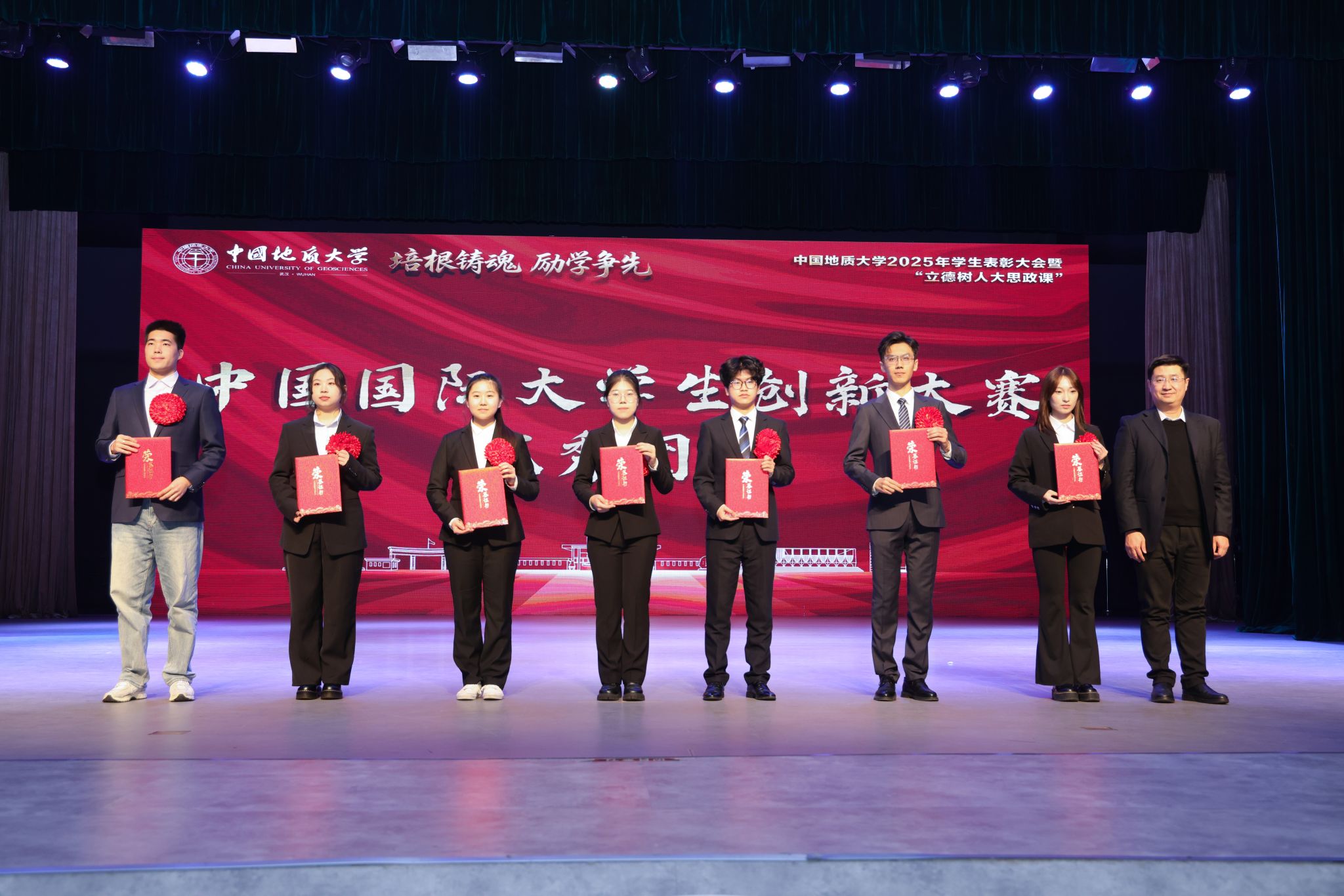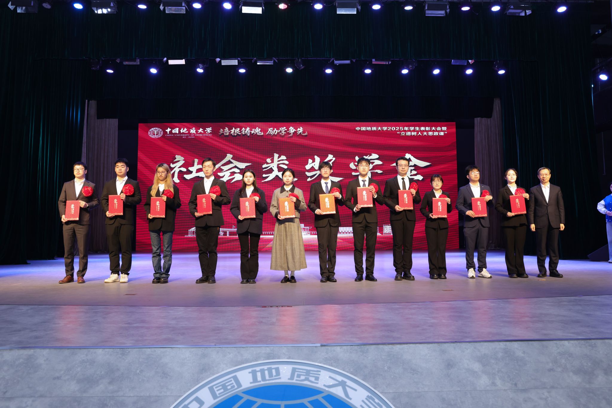 国家奖学金获奖代表赵汪钖、校长奖学金获奖代表谷天顺、社会类奖学金获奖代表孙钰涵、中国国际大学生创新大赛优秀团队代表何乔、先进班集体标兵代表余晨欣分别发言。他们在分享中细数成长历程里直面困境的坚韧、携手同行的温暖与追逐理想的执着,并表示,作为新时代地大学子,将始终怀揣对学校培育与各方支持的感恩之心,坚守“培根铸魂、励学争先”的精神追求,在学习科研中勇攀高峰,在实践奉献中增长才干,努力以实际行动诠释青年担当。