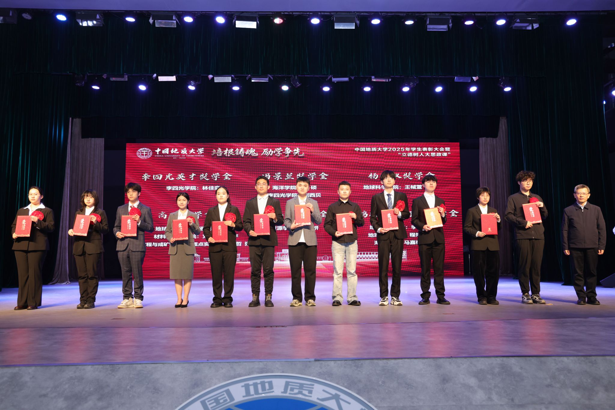 李建威为李四光英才奖学金、冯景兰奖学金、杨遵仪奖学金、高山奖学金、赵鹏大奖学金、殷鸿福与金钉子奖学金获奖代表颁奖
