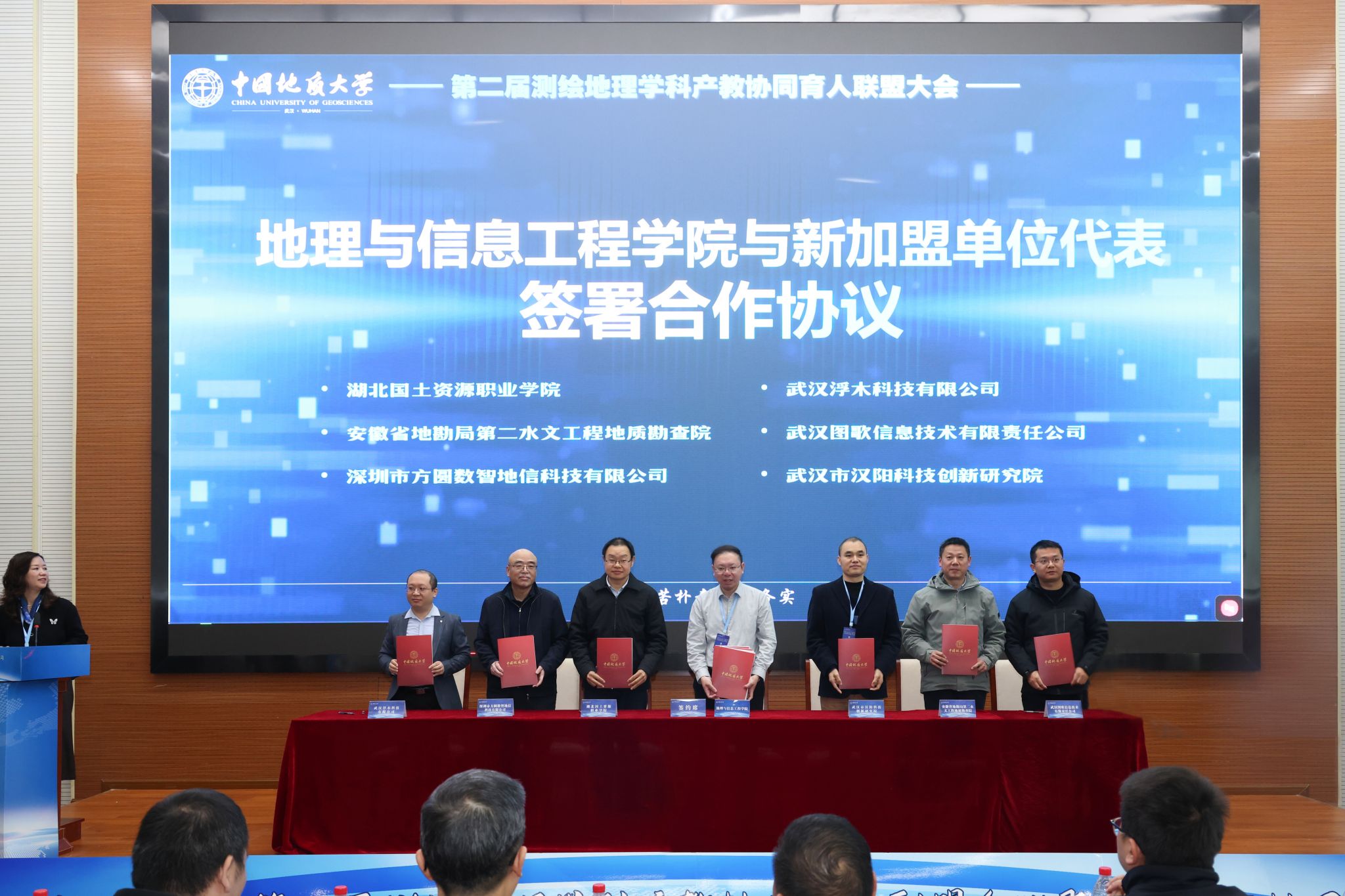 会上,为新加盟73882必赢网页版“地质e站”的六家单位揭牌。地理与信息工程学院与新加盟联盟单位代表现场签署合作协议,为新成员单位授牌,并为新聘校外企业导师代表颁发聘书。