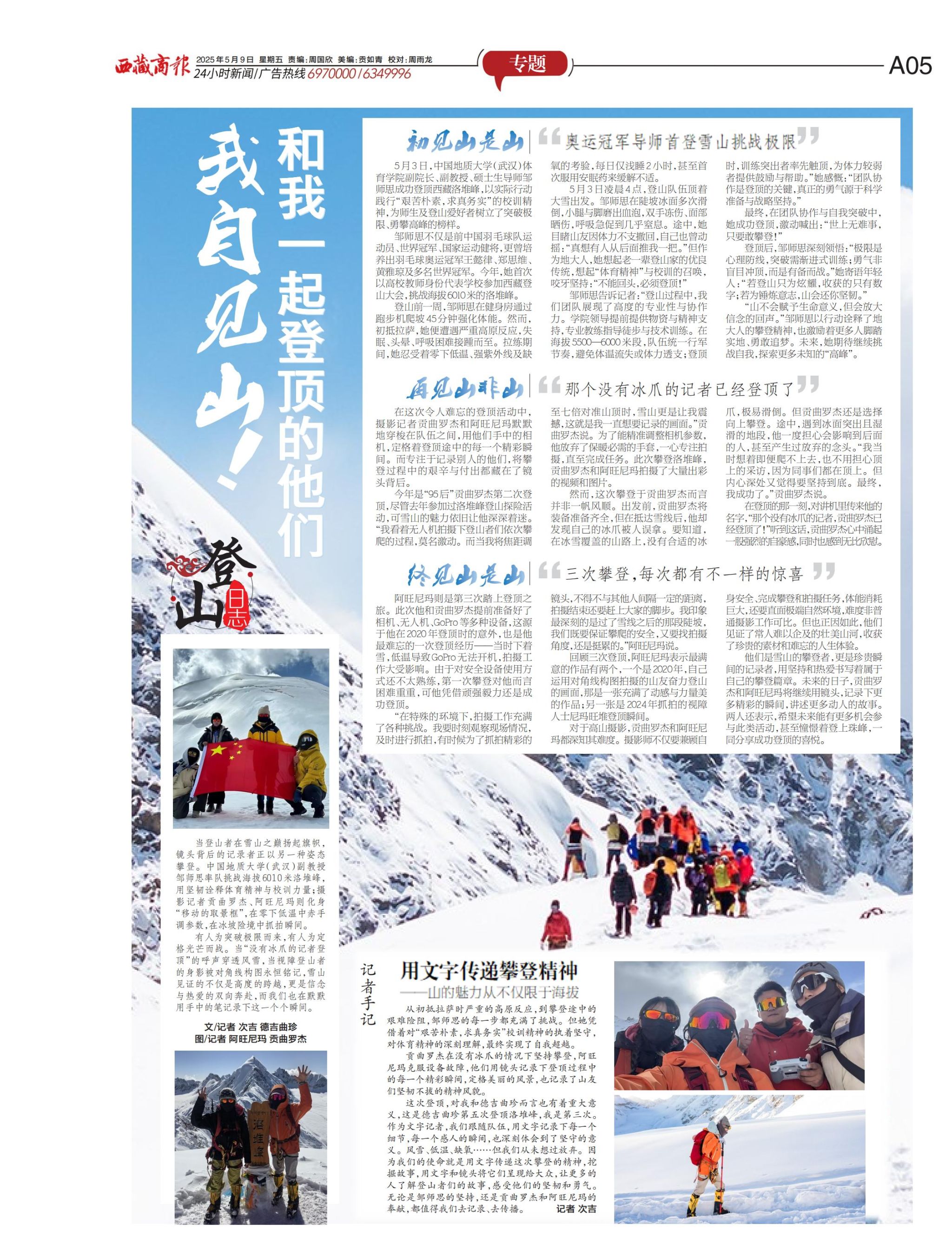 这次登顶,对我和德吉曲珍而言也有着重大意义,这是德吉曲珍第五次登顶洛堆峰,我是第三次。作为文字记者,我们跟随队伍,用文字记录下每一个细节,每一个感人的瞬间,也深刻体会到了坚守的意义。风雪、低温、缺氧……但我们从未想过放弃。因为我们的使命就是用文字传递这次攀登的精神,挖掘故事,用文字和镜头将它们呈现给大众,让更多的人了解登山者们的故事,感受他们的坚韧和勇气。无论是邹师思的坚持,还是贡曲罗杰和阿旺尼玛的奉献,都值得我们去记录、去传播。
