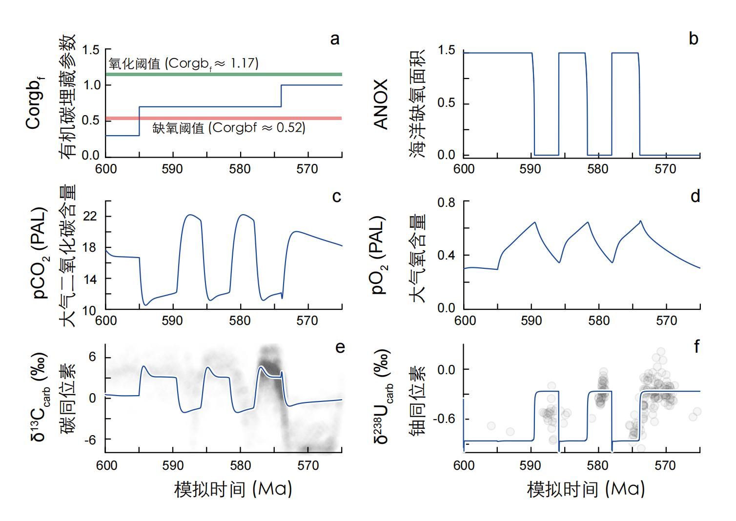 图1. 模型状态从稳定缺氧转变为极限循环波动,这一转变由逐步增加的总有机碳埋藏所驱动。