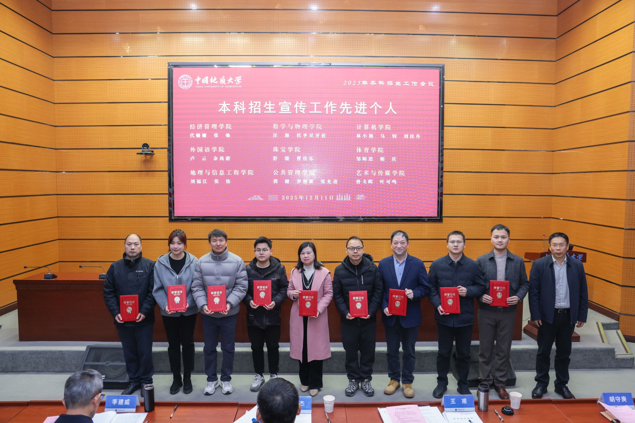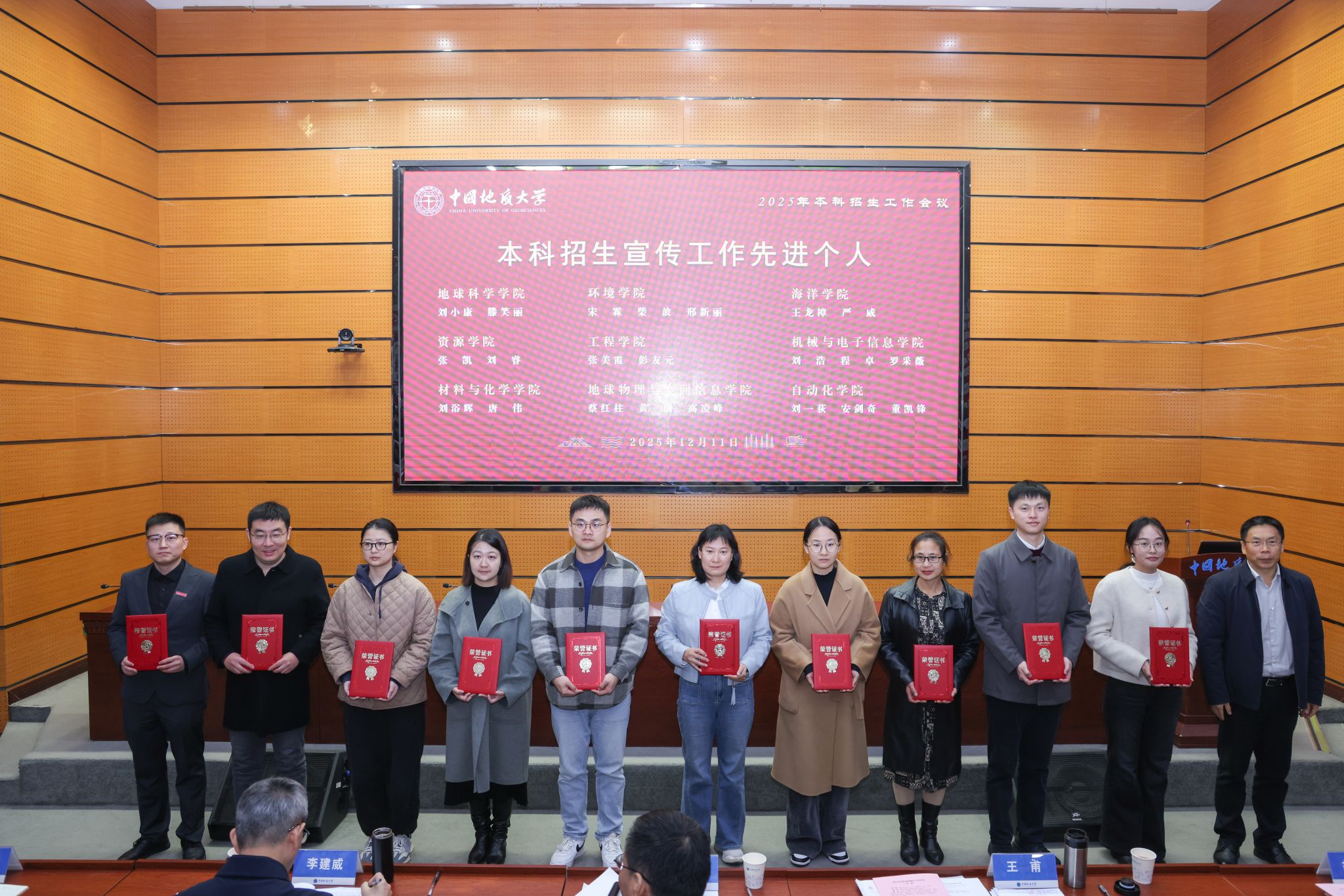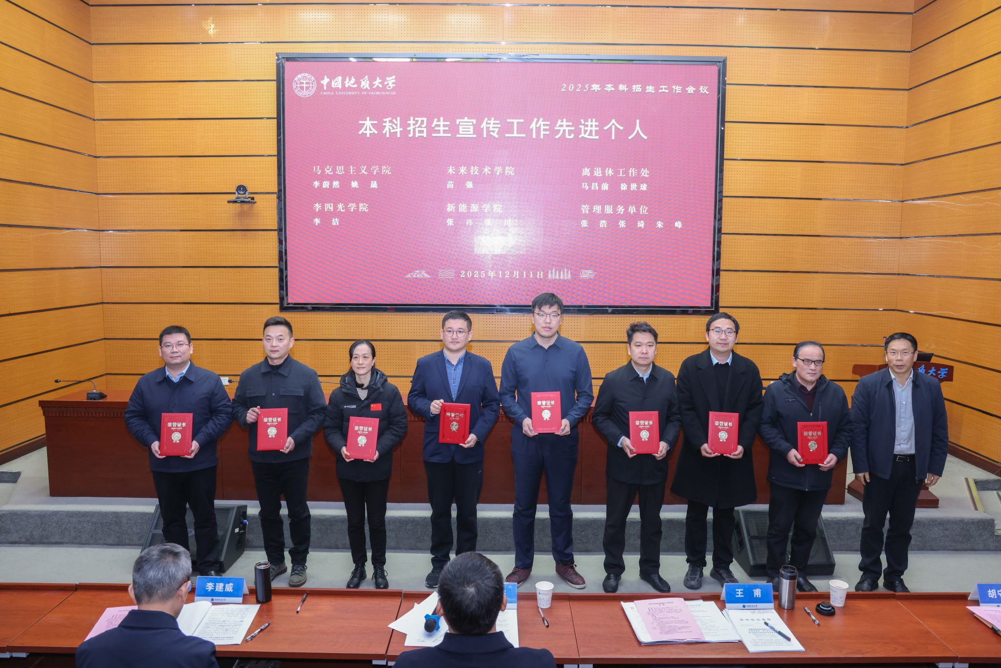 李建威为本科招生宣传工作先进单位颁奖,王甫为本科招生宣传工作先进个人颁奖,胡守庚为教师参与、学生参与优秀单位颁奖。