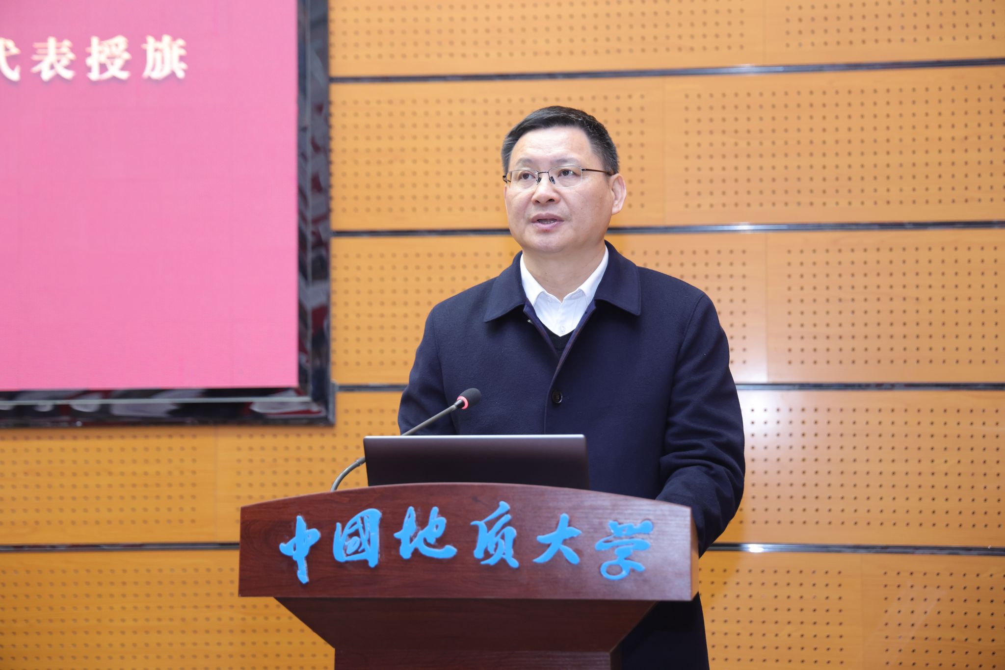 章军锋为第十四届“我把地大带回家”学生团队代表授旗。