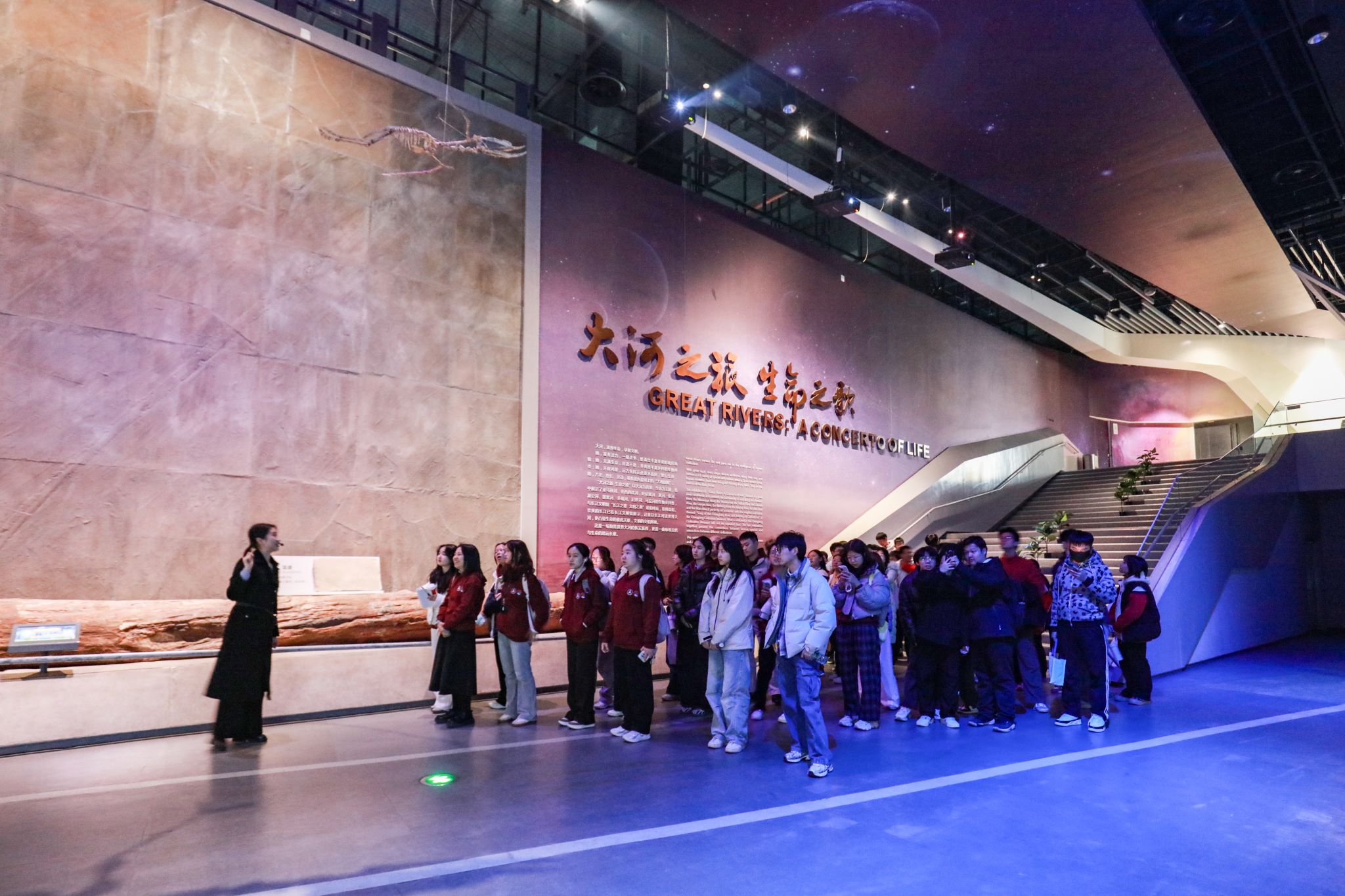 讲座结束后,师生集体开展了研学考察。在长江文明馆,师生们循着历史脉络有序参观,通过文物实物、场景复原、多媒体交互等多元展陈形式,沉浸式触摸长江流域百万年人类演进的足迹、一万年文化发展的脉络与五千年文明传承的精髓。在贝林大河生命馆,极具视觉冲击力的生物标本、生态场景复原与生命演化科普展项,生动呈现了长江流域乃至全球大河的生态系统与生命奇观,让师生直观领略到万物共生的自然之美,深刻认识到河流生态对于文明存续的重要意义。